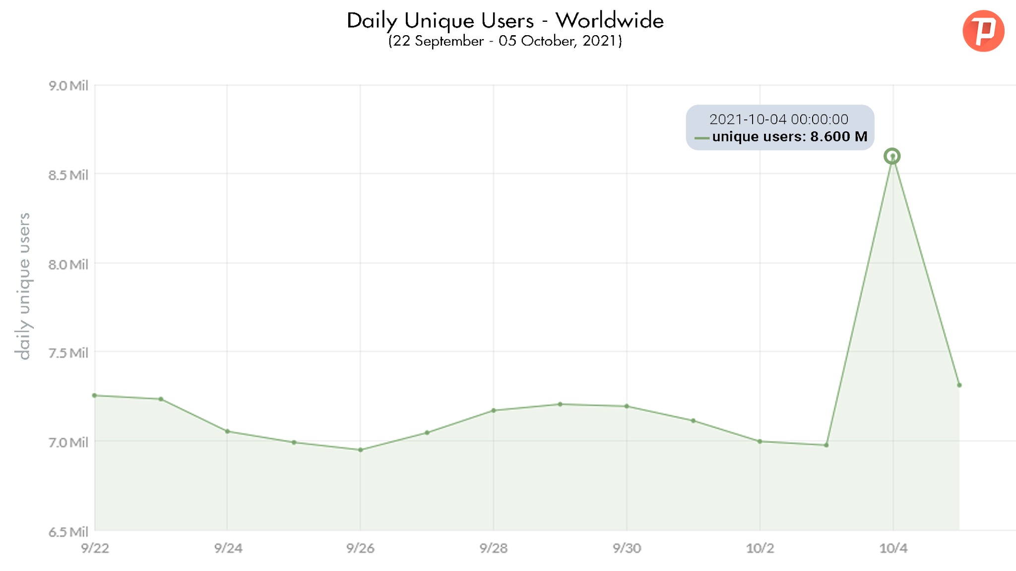 - Psiphon’s global usage surged by 1.75 Million daily unique users during the Facebook outage on October 4th, 2021.